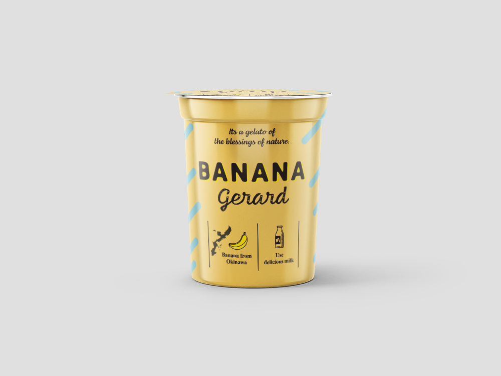 バナナジュースがメディアで一時期話題となり、新店舗が都内にもできたというニュースを見て、需要の高まりを感じバナナジェラートを想定したカップパッケージを作成。それにしても、バナナジュースって美味しいですよね。